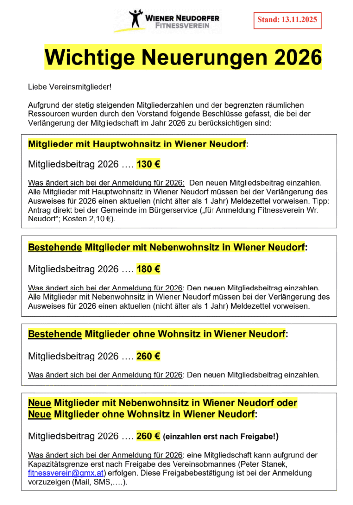 Bürgerservice einen aktuellen Meldezettel („für Anmeldung Fitnessverein Wr. Neudorf“; Kosten 2,10 €) und bringen Sie diesen zur Anmeldung in unserem Vereinsbüro mit (bitte auch bestehende Mitglieder).